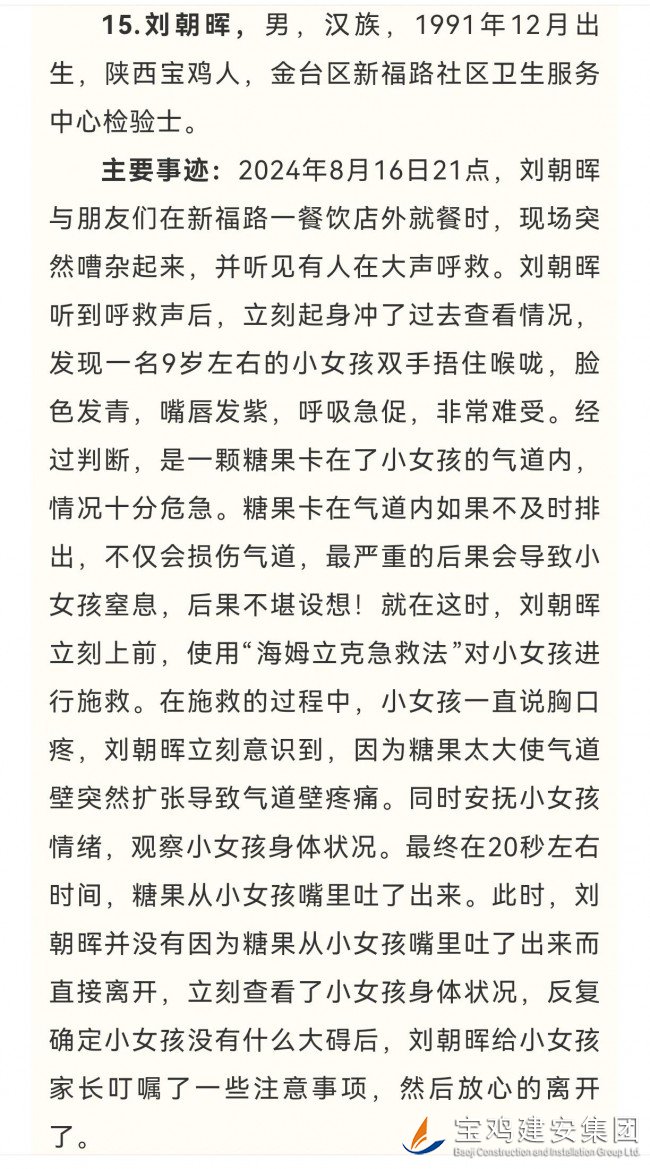 日前,宝鸡市见义勇为基金会面向全社会对拟发布为“宝鸡市见义勇为人物”人选进行了公示,经由公司工会推荐上报的新福路社区卫生服务中心检验士刘朝晖同志光荣入选,榜上有名。